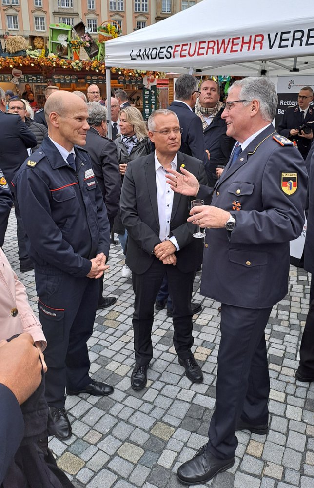 Fahrzeugübergabe an die Landesfeuerwehrverbände Die Vertreteter der Stadt im Gespräch mit DFV-Präsident Banse